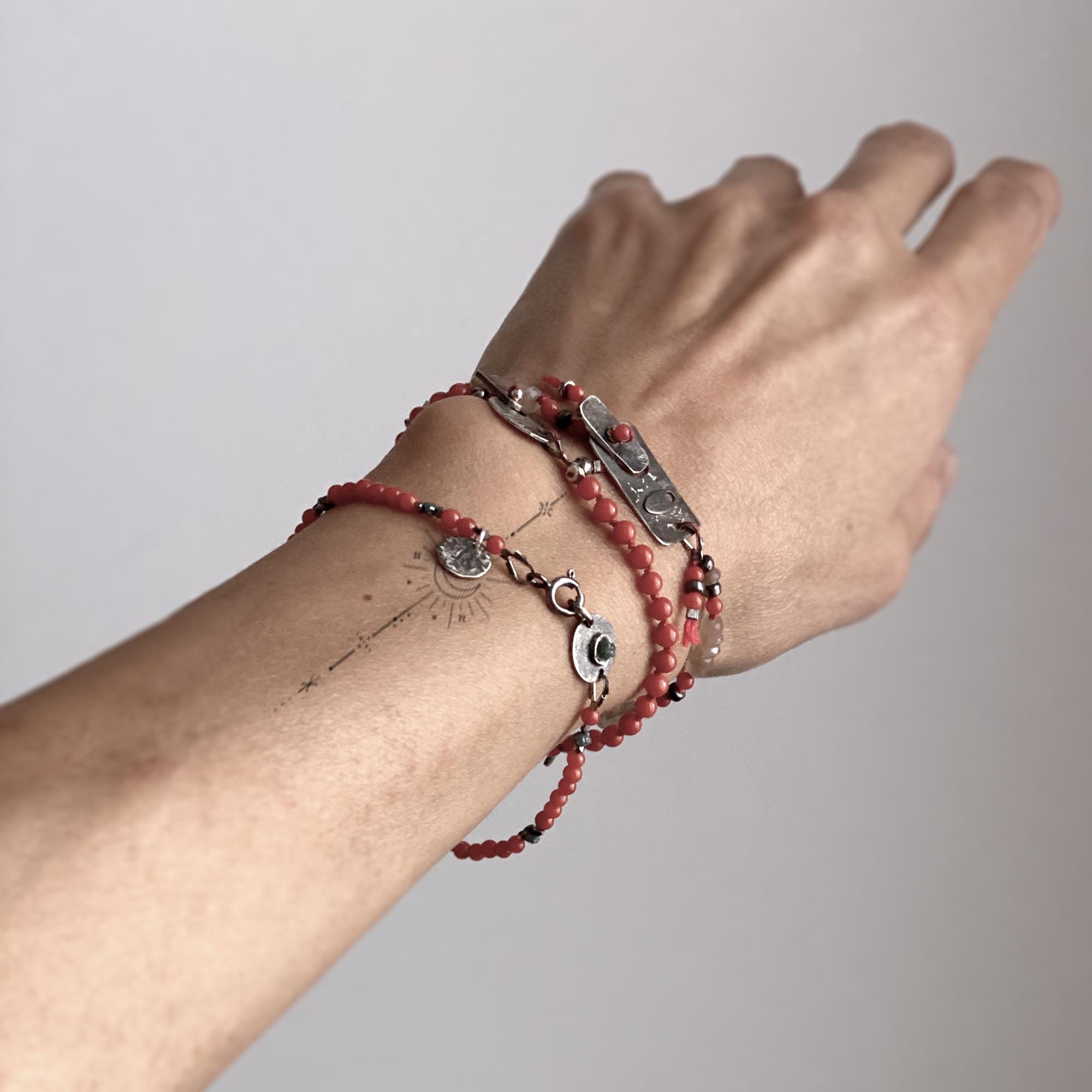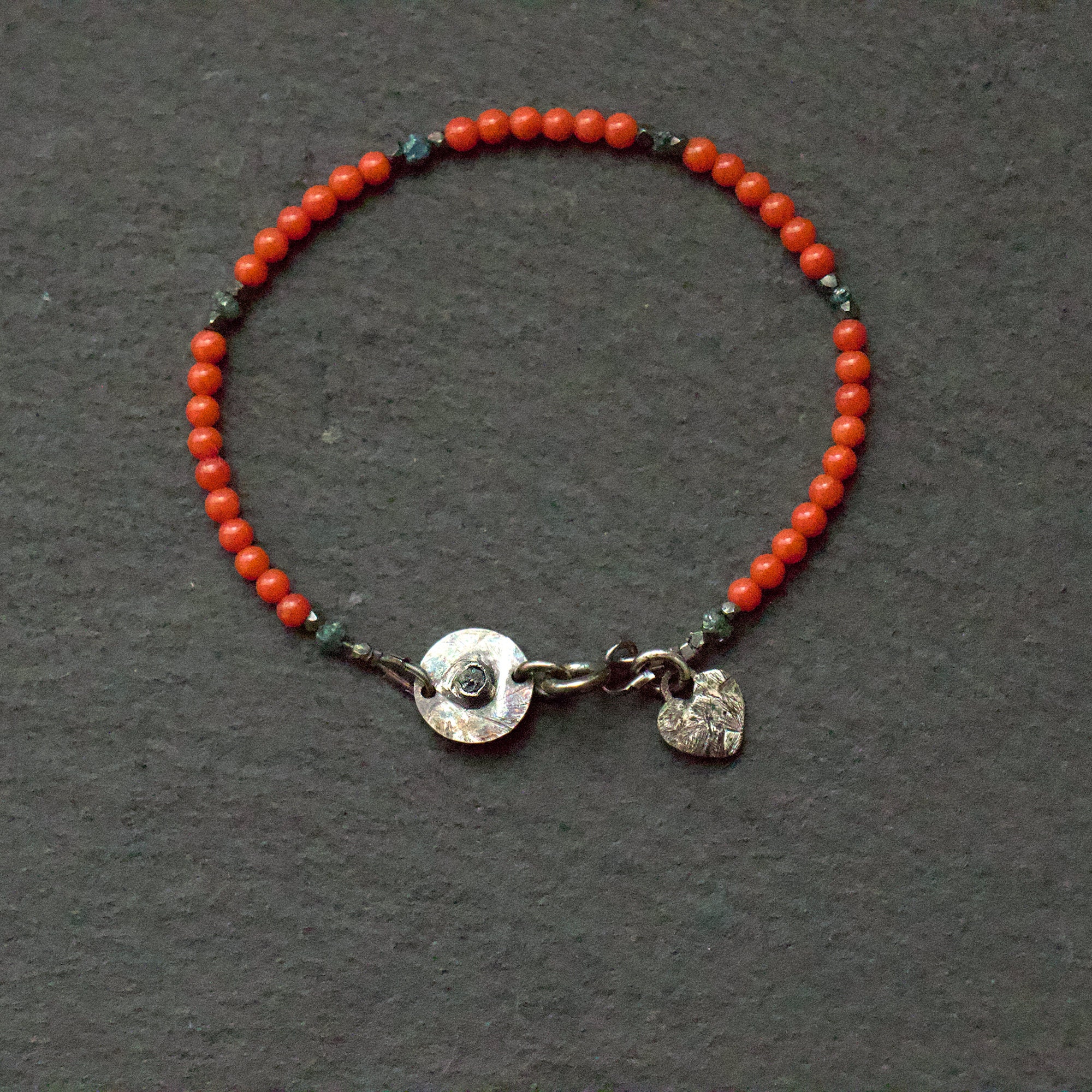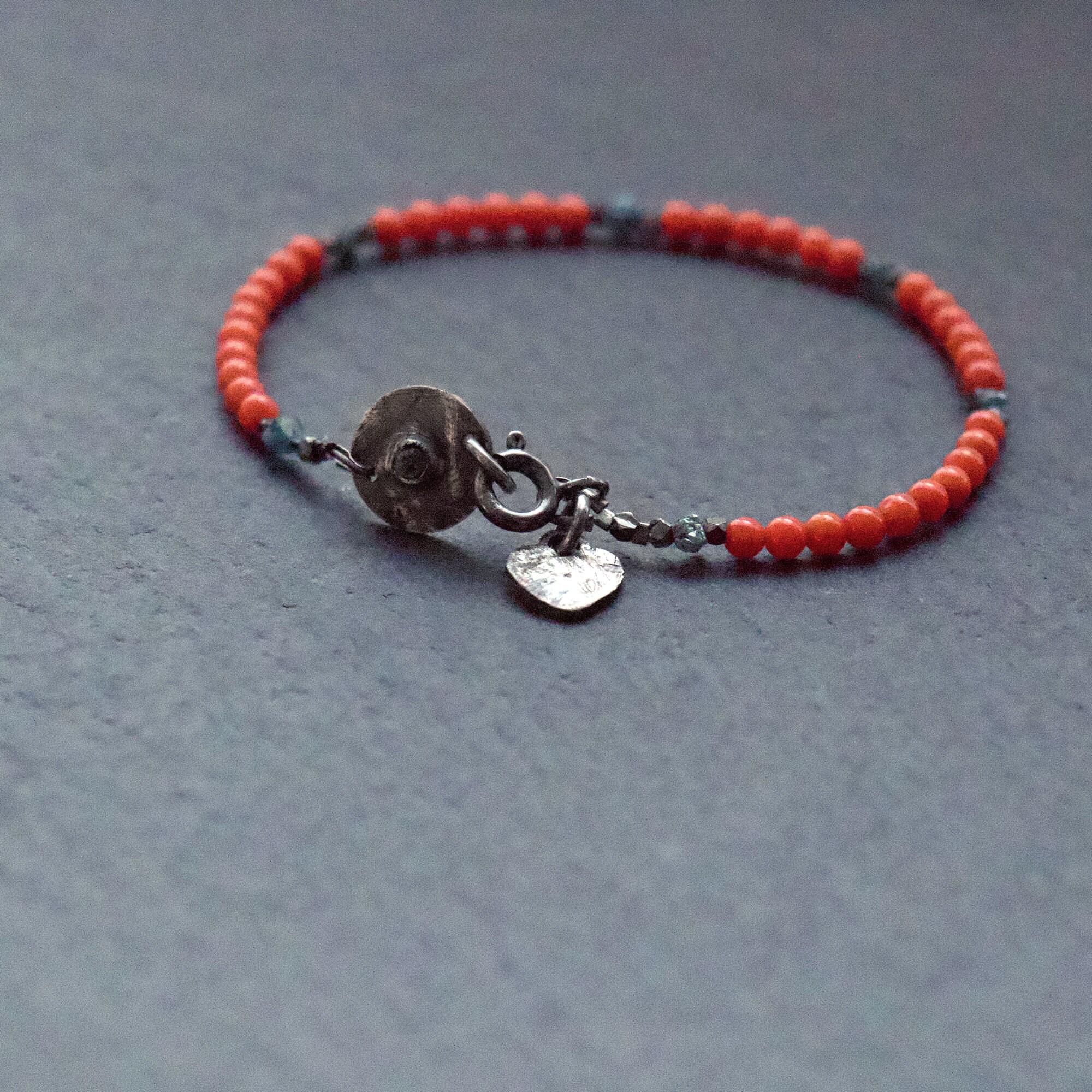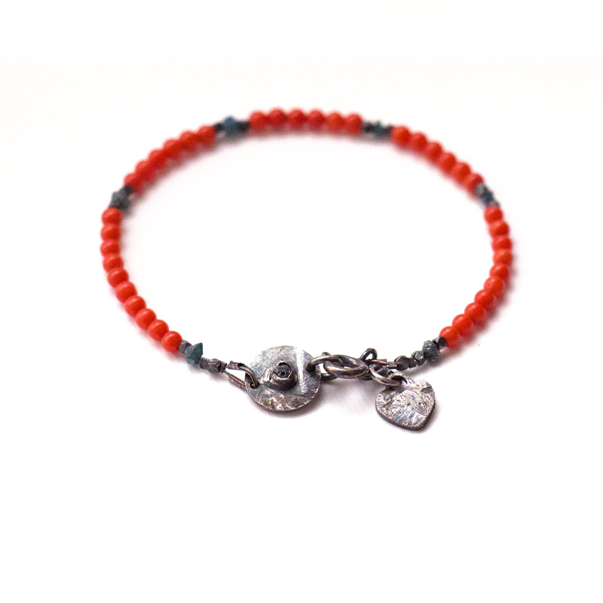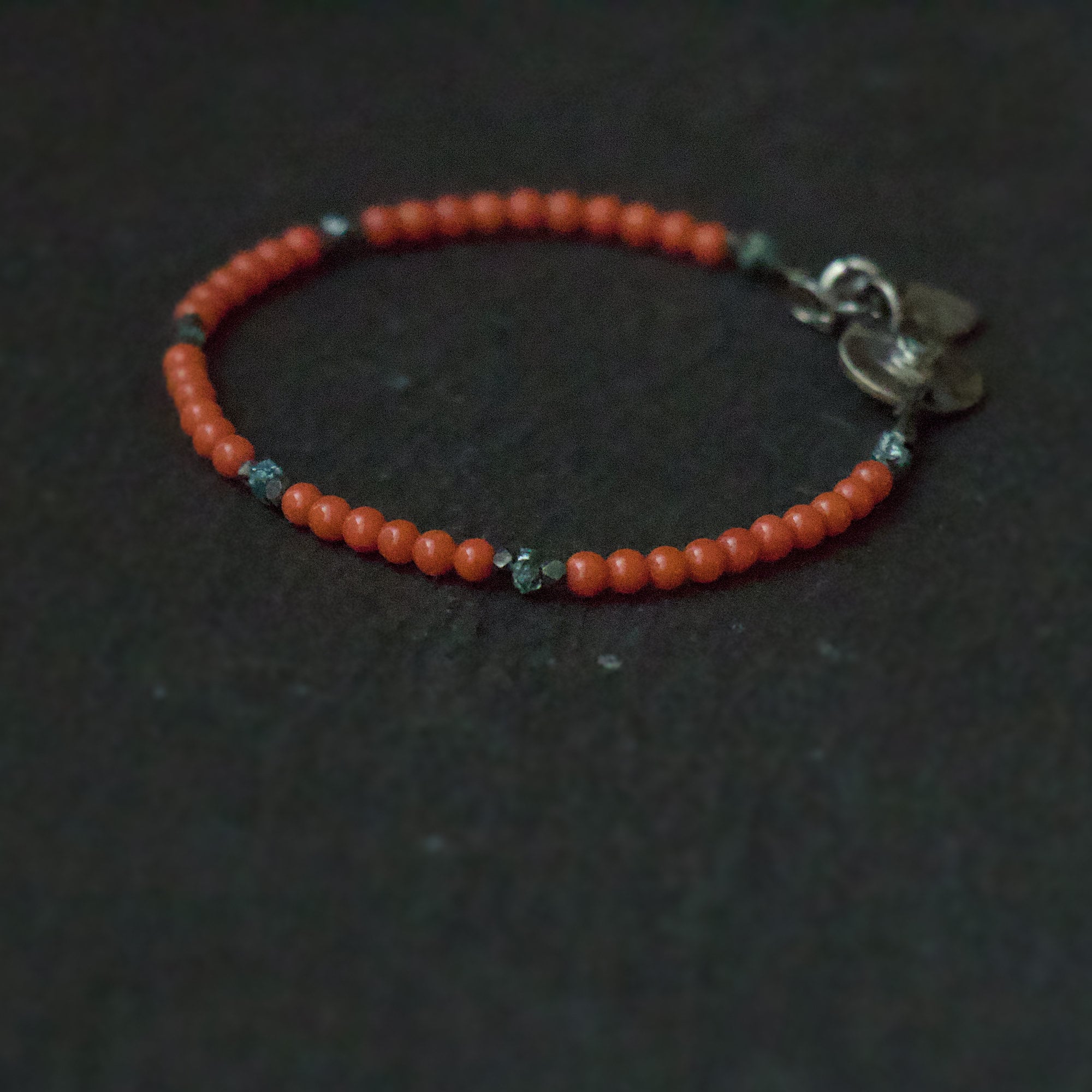 Unique hand crafted bracelet made from natural Adriatic Corals (size 3mm), blue raw Diamonds (2-3mm) and oxidised 925 silver.