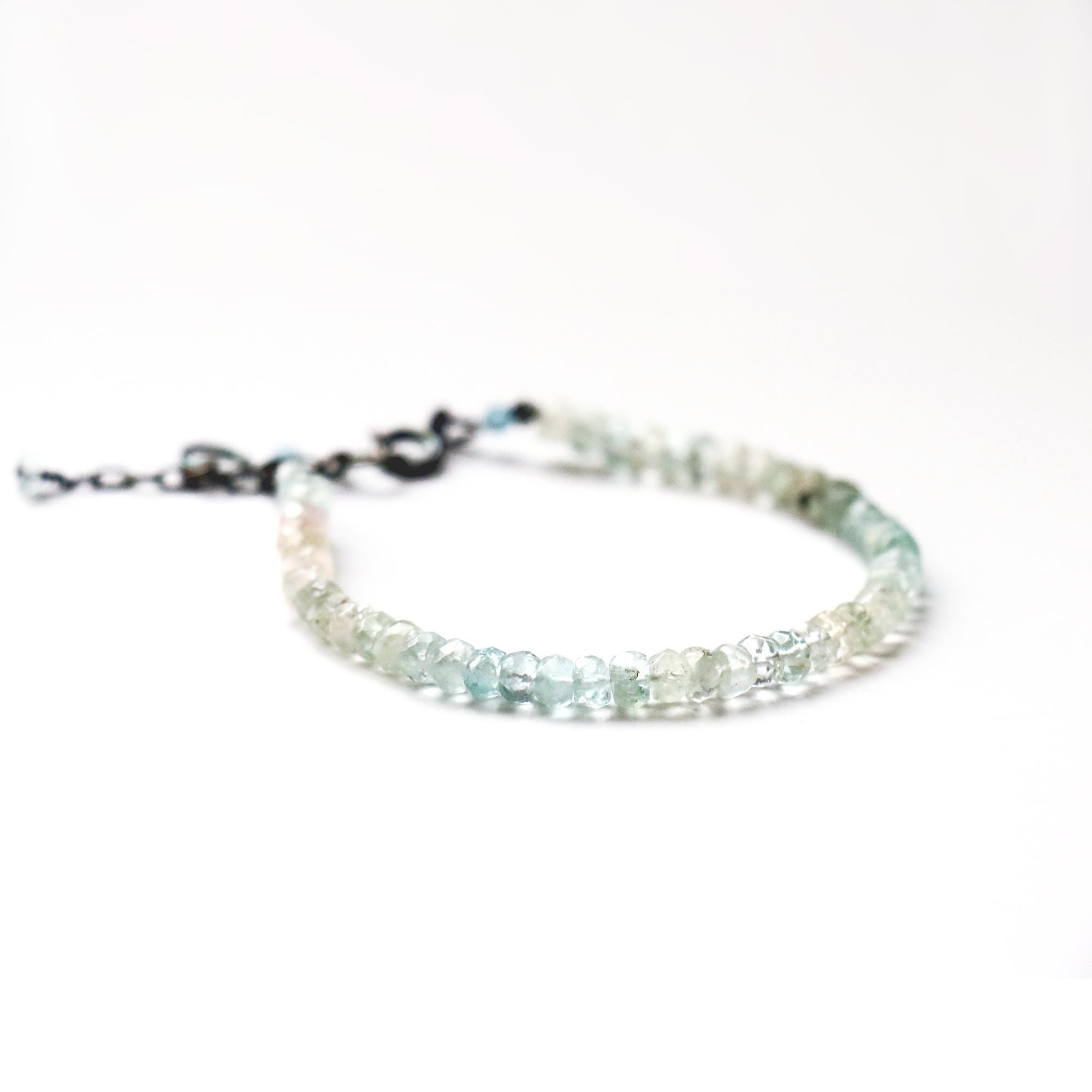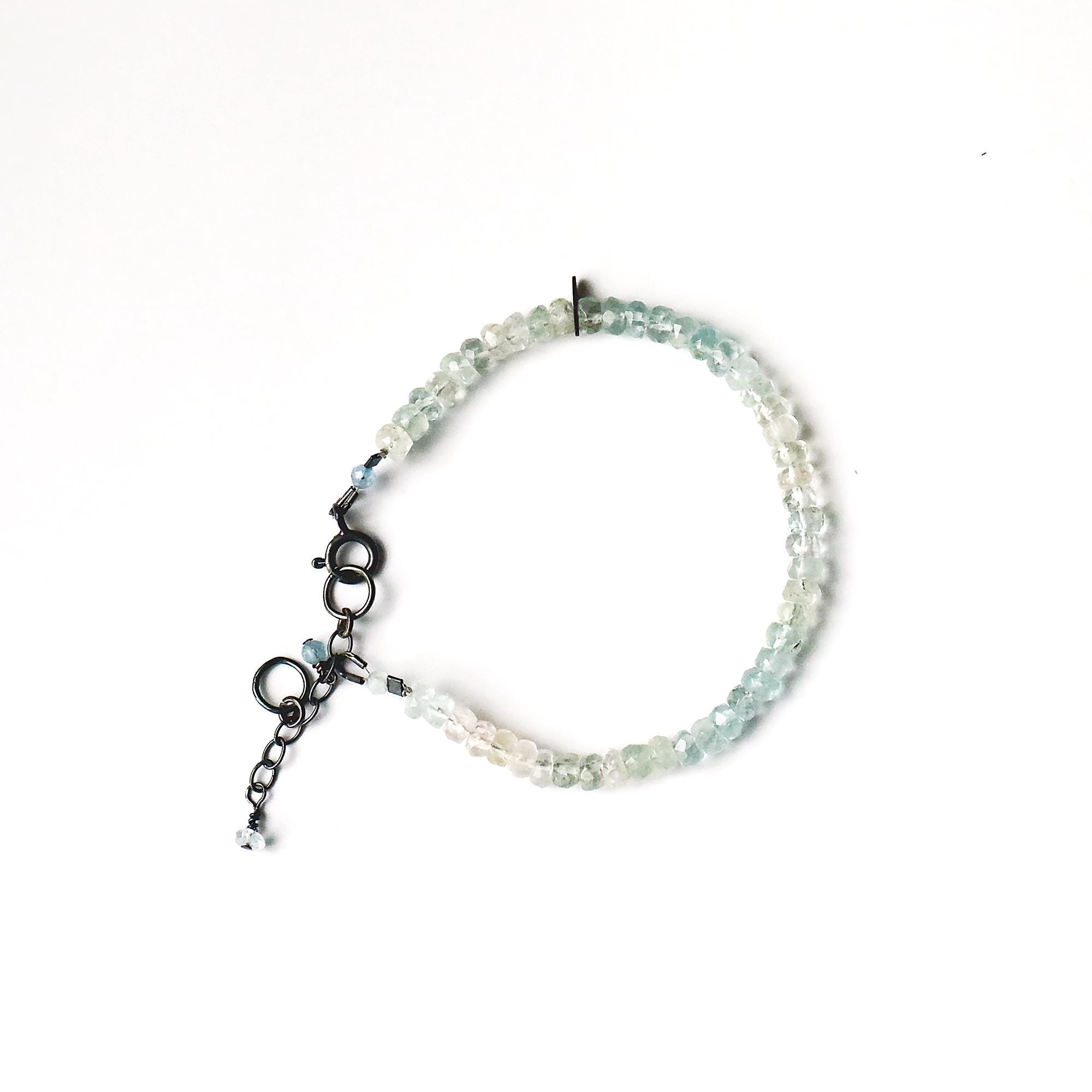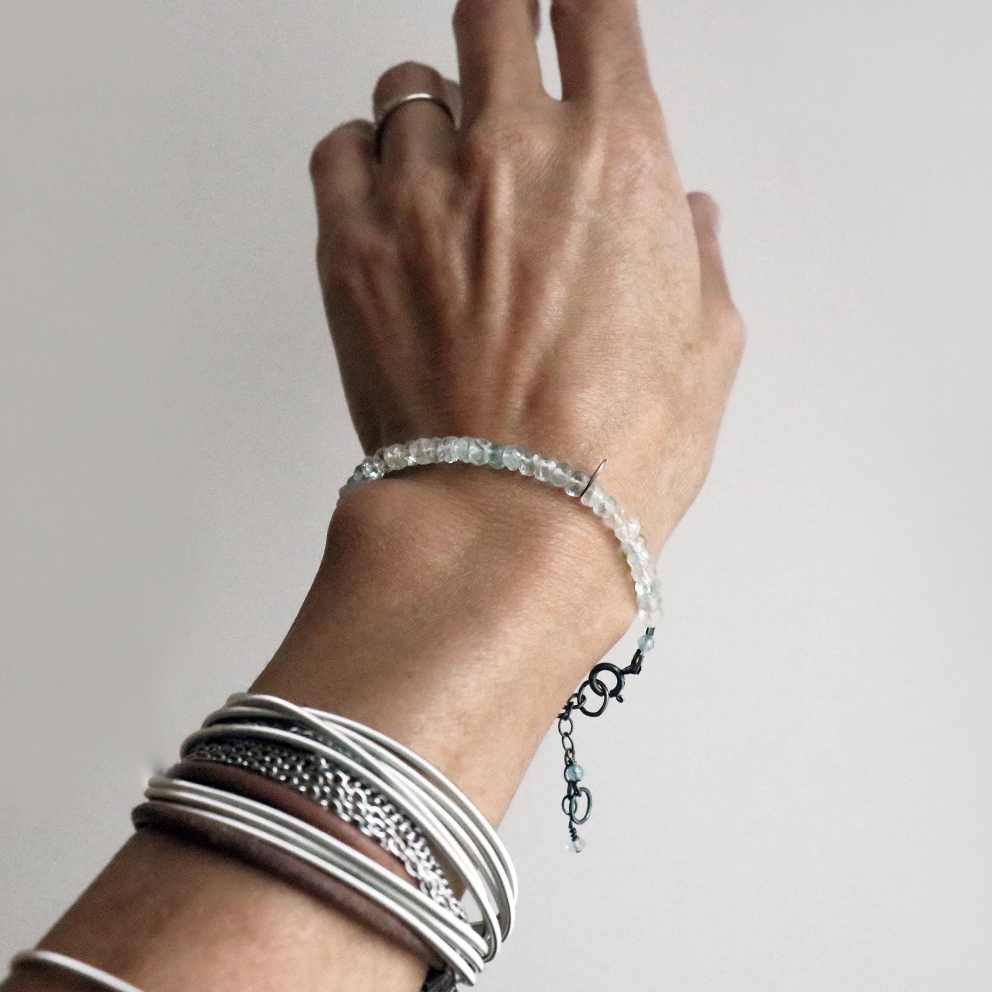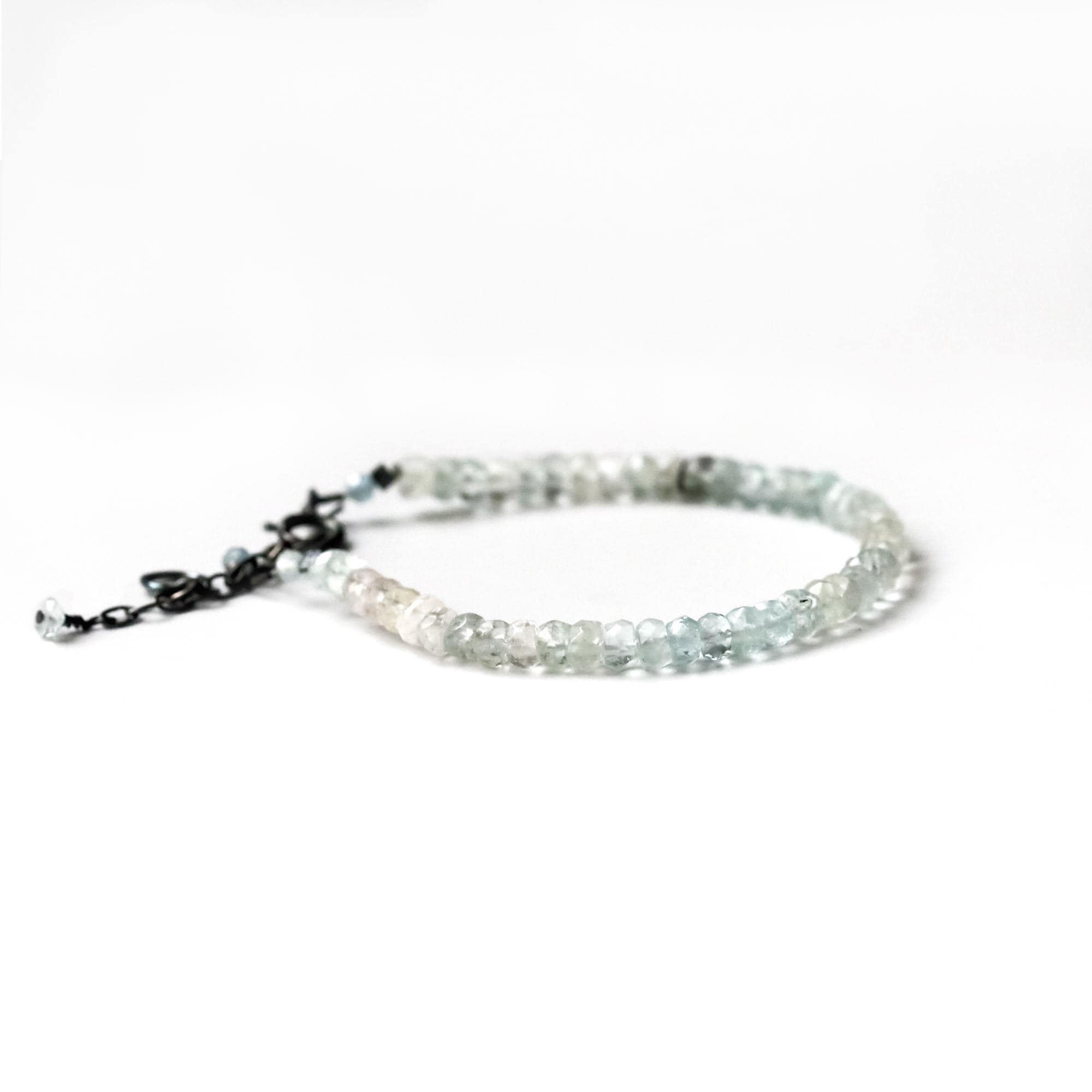 This elegant bracelet features natural aquamarine gemstones paired with oxidized sterling silver findings for a subtle, vintage-inspired look. The soft blue and translucent tones of the aquamarine beads evoke calmness and clarity, making this piece perfect for everyday wear or as a thoughtful gift.