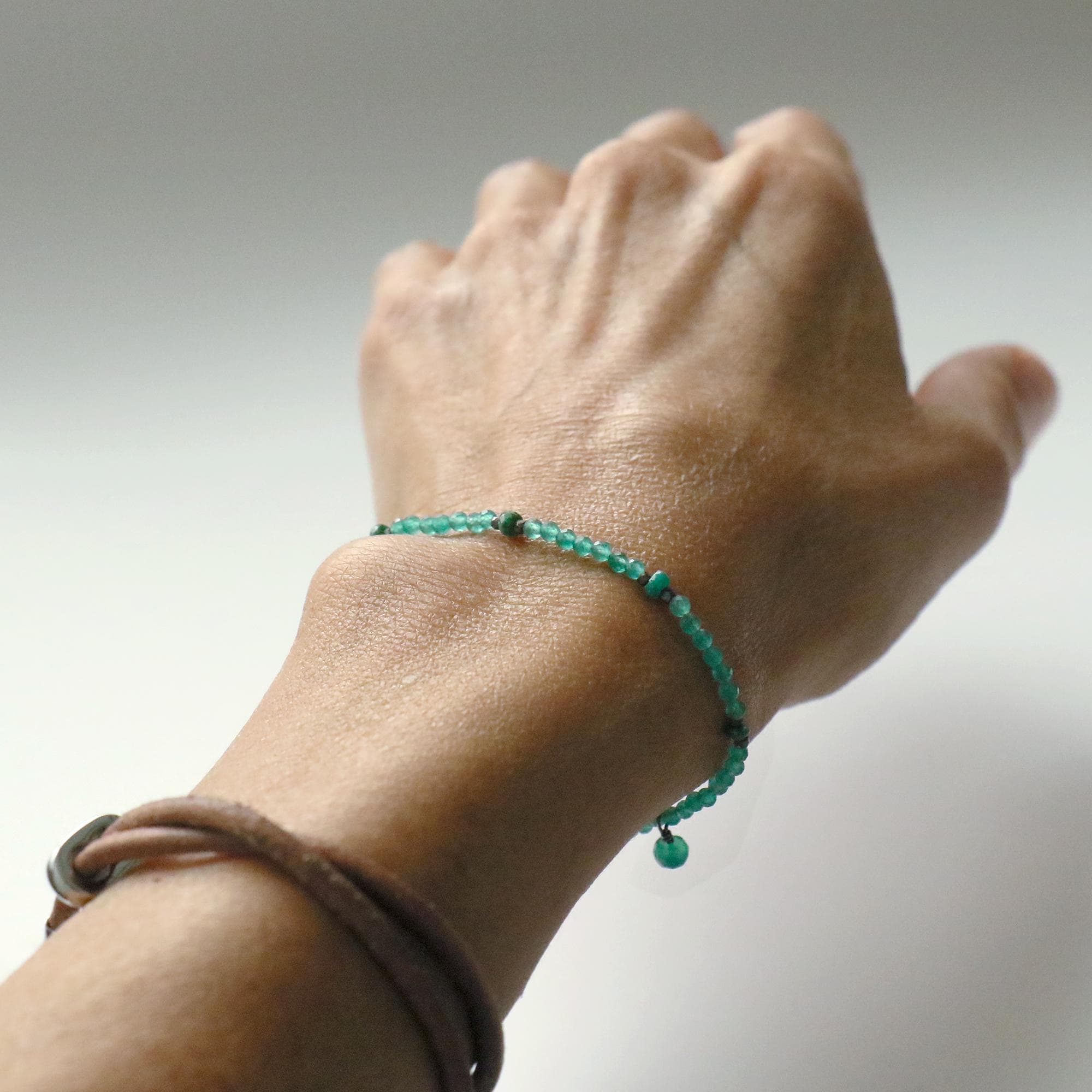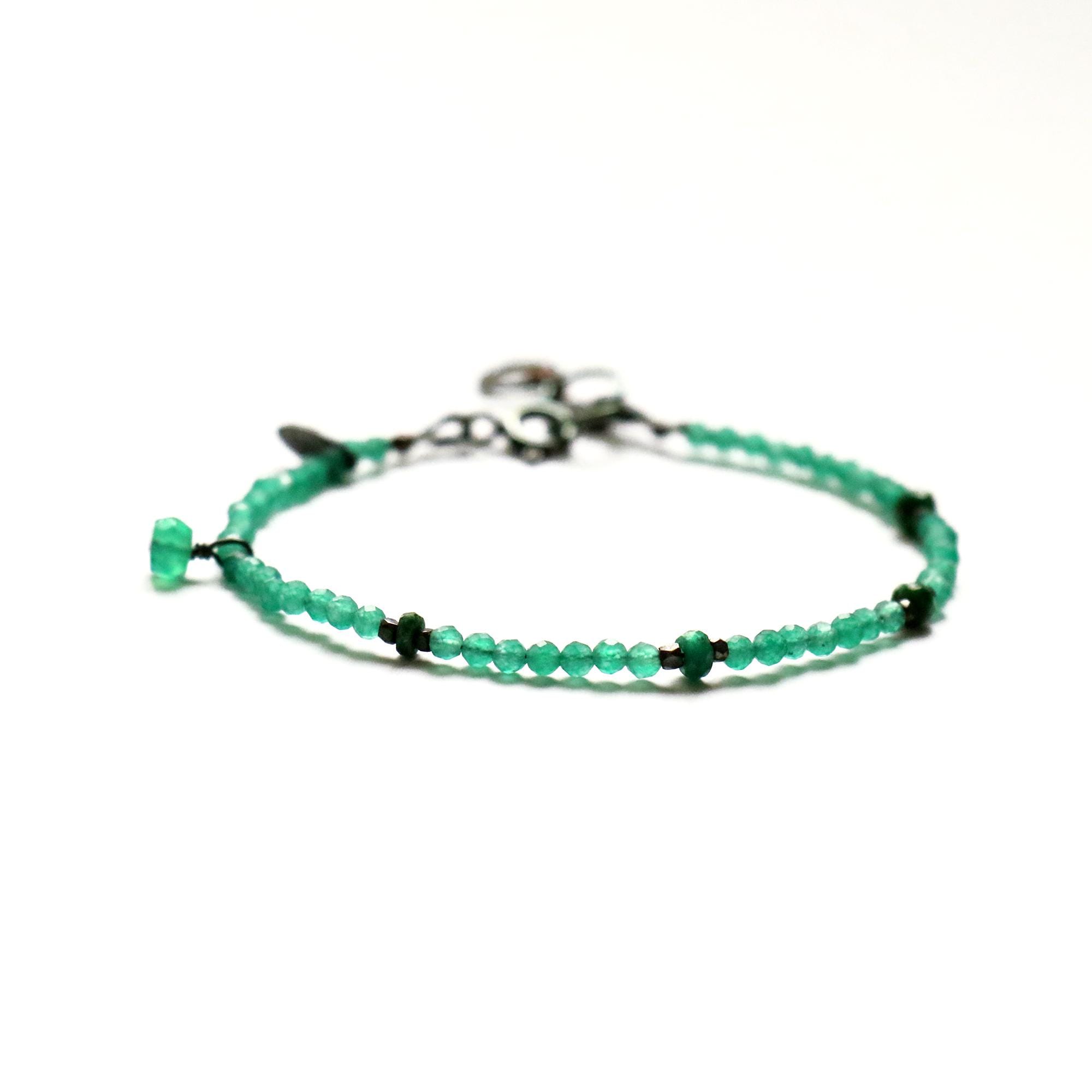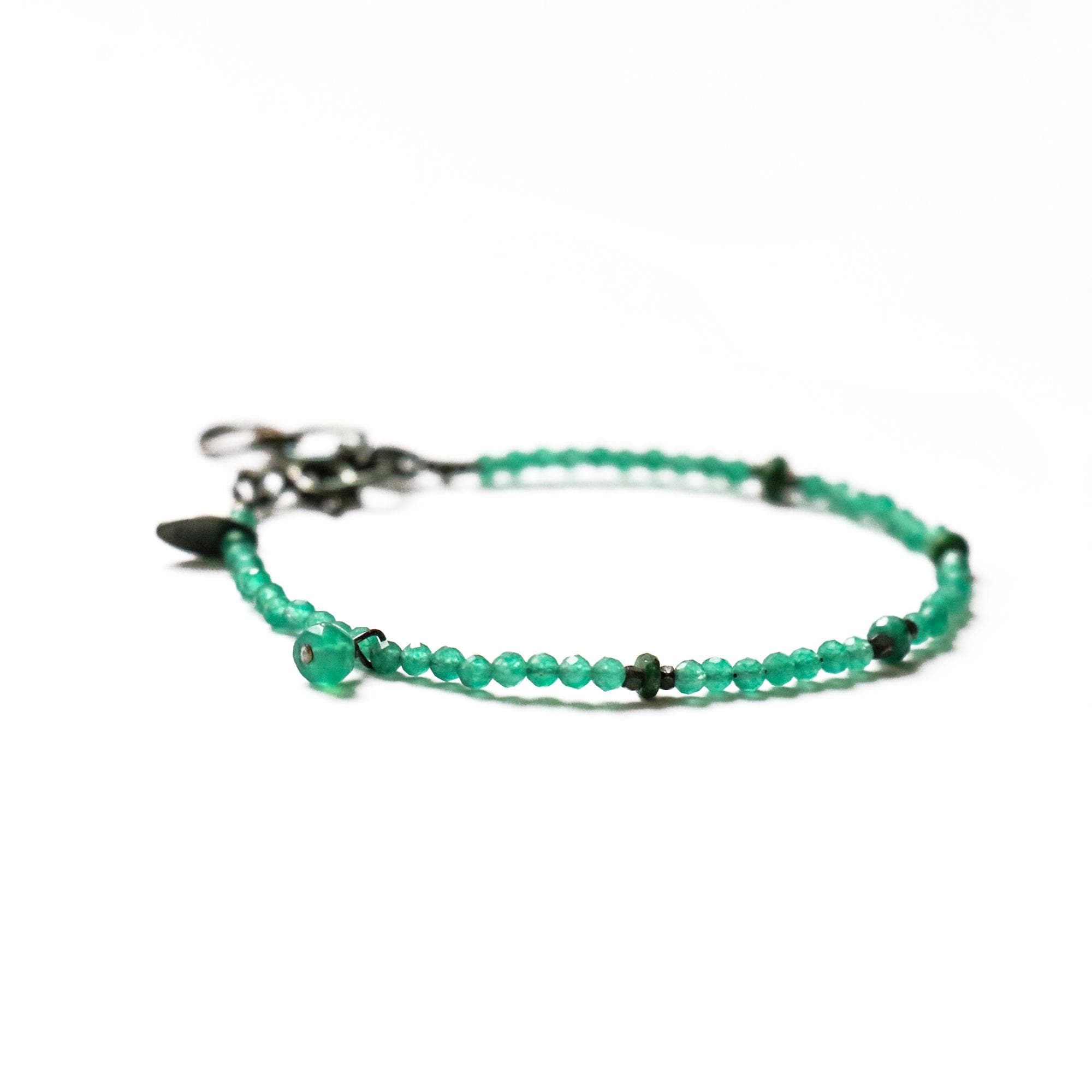 This bracelet is crafted from mini natural green onyx beads, beautifully accented with exquisite green emerald details. The oxidized silver clasp and chain add a touch of vintage charm, making this bracelet a versatile accessory for any occasion.