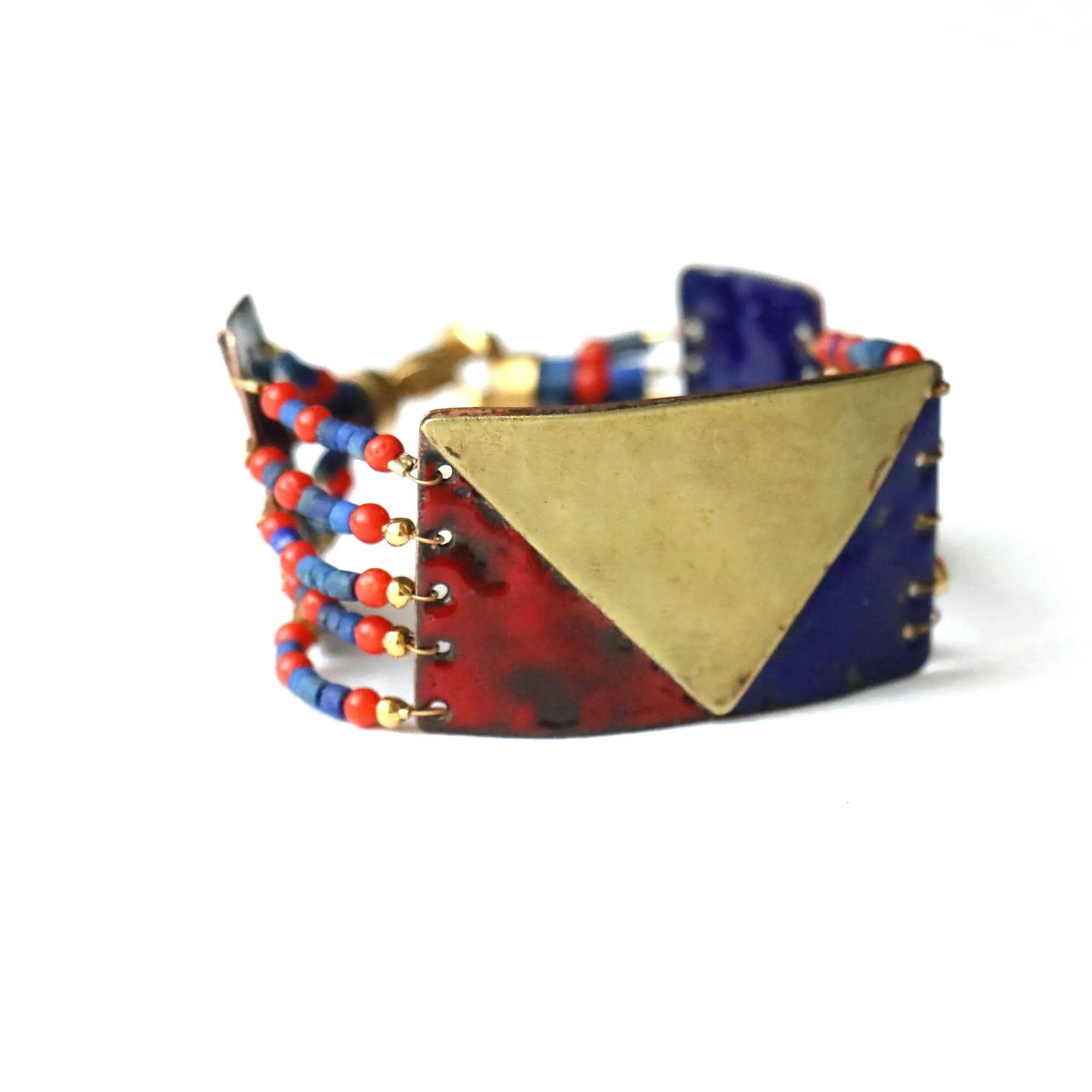 Add a pop of color and unique style to your accessory collection with this handcrafted geometric beaded bracelet. Featuring bold, vibrant hues of red, blue, and gold, this statement piece is designed with eye-catching geometric shapes and intricate beadwork. Perfect for both everyday wear and special occasions, it effortlessly combines artistry and elegance. Made with high-quality materials, this bracelet is a one-of-a-kind accessory that will elevate any outfit. A great gift for fashion lovers and those who appreciate handcrafted jewelry.