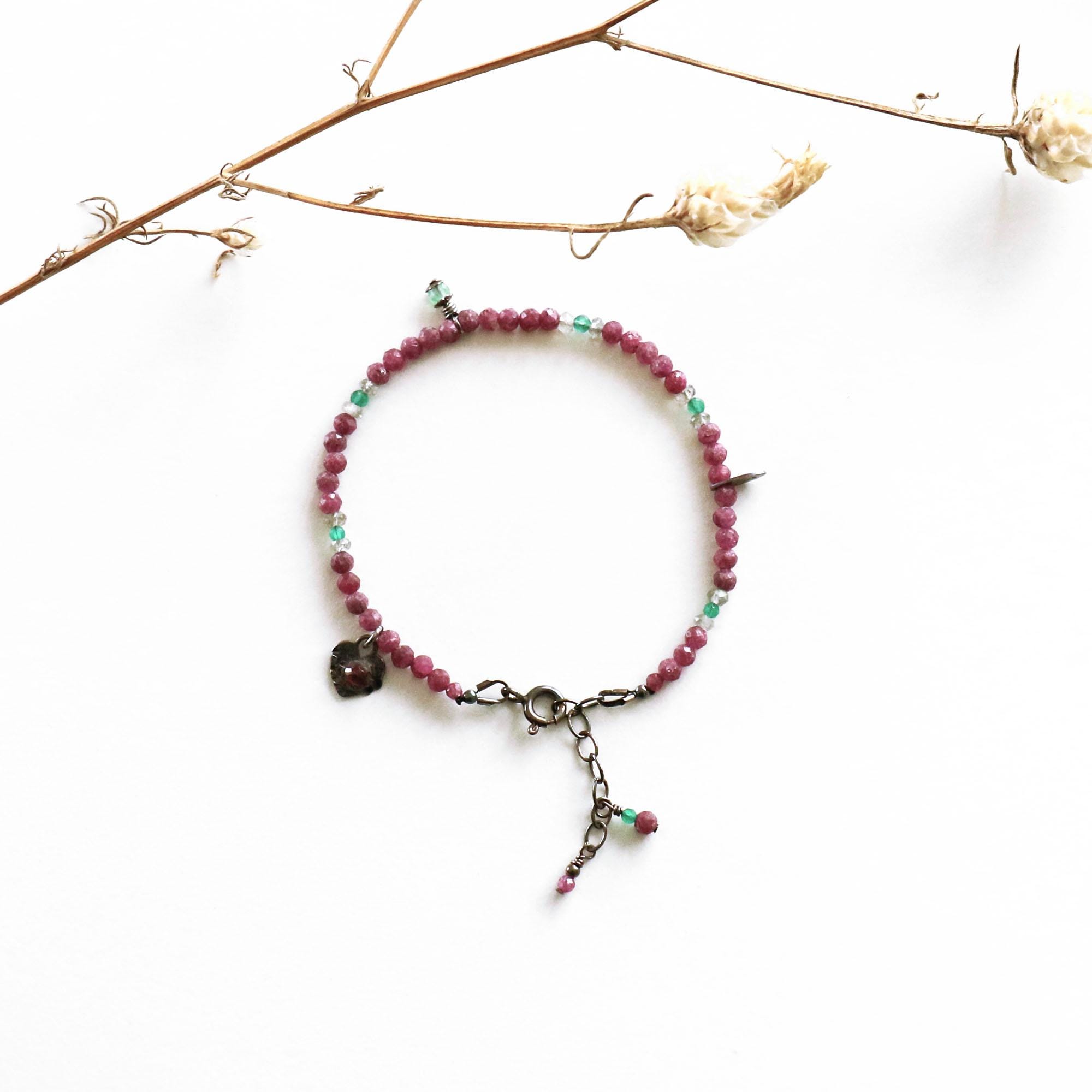 Crafted with exquisite ruby beads, vibrant green onyx, and mesmerizing labradorite details, this piece is a true statement of elegance. The oxidized silver clasp and chain add a touch of vintage charm, while the delicate silver heart charm completes the look with a hint of romance.