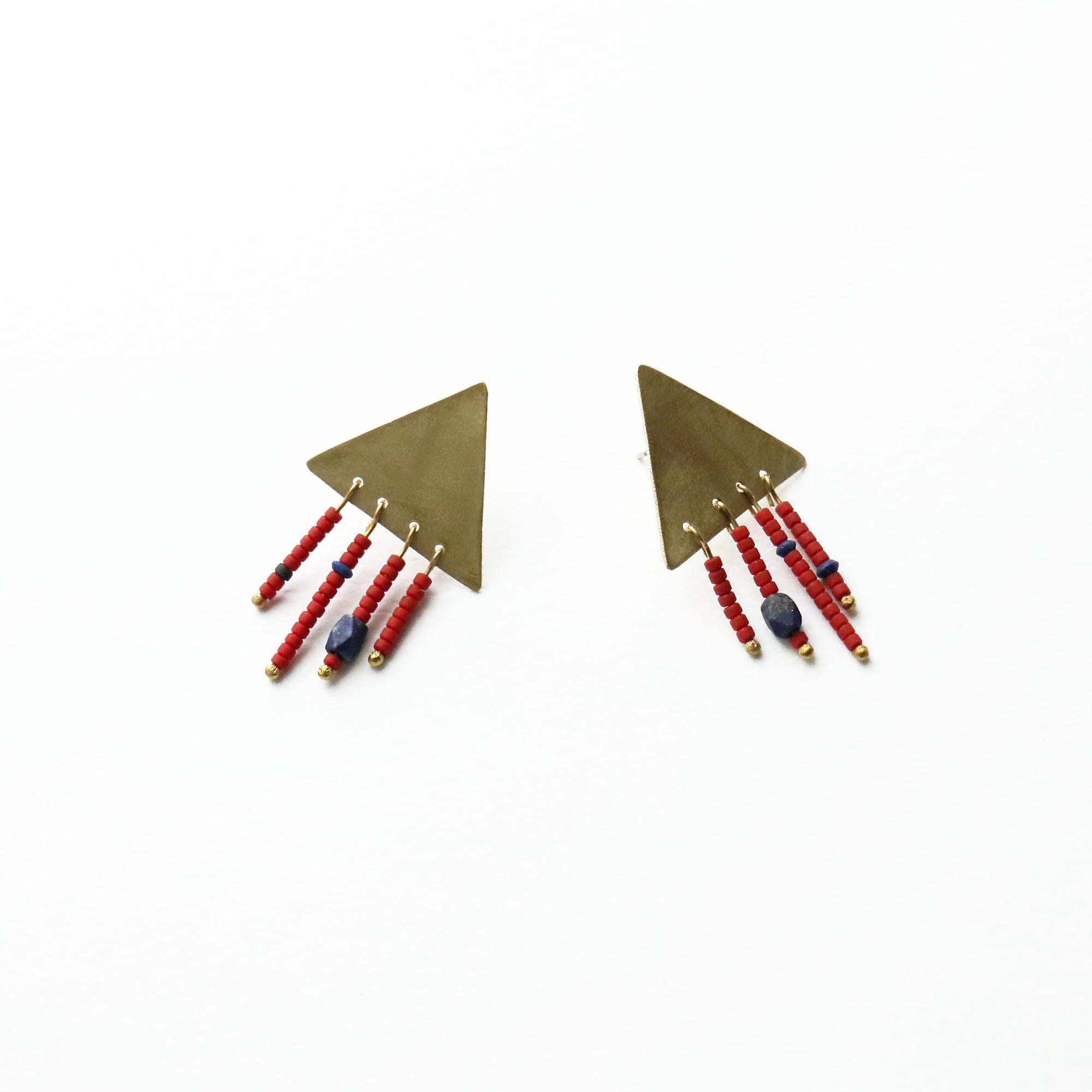 Crafted from brass, these triangle earrings feature delicate hanging strands of red Afghan stones beads and Lapis Lazuli, creating a rich contrast of color and texture. Each piece is entirely handmade and one of a kind, perfect for those who love jewelry with character and meaning.