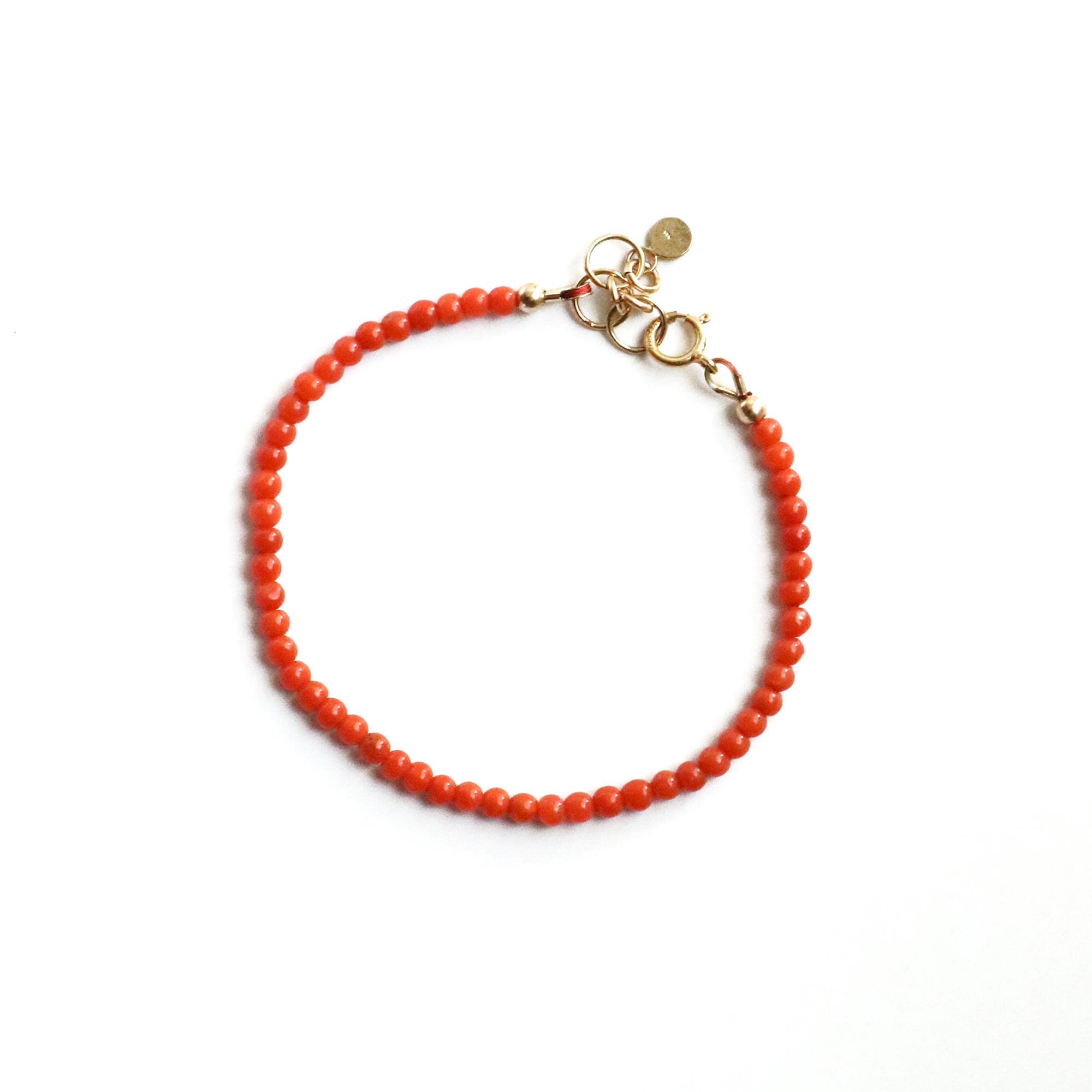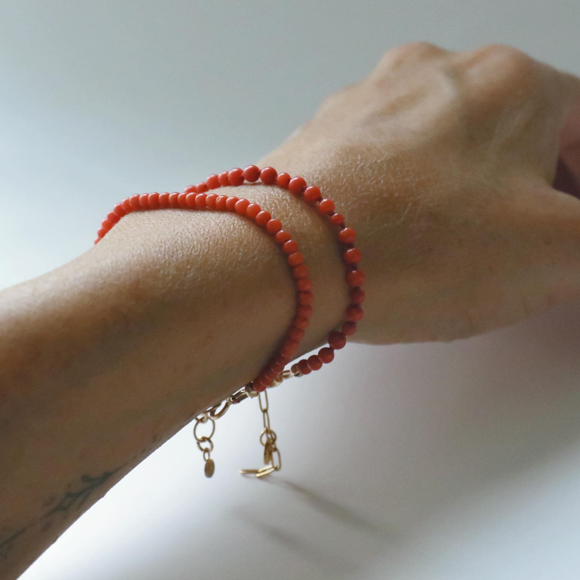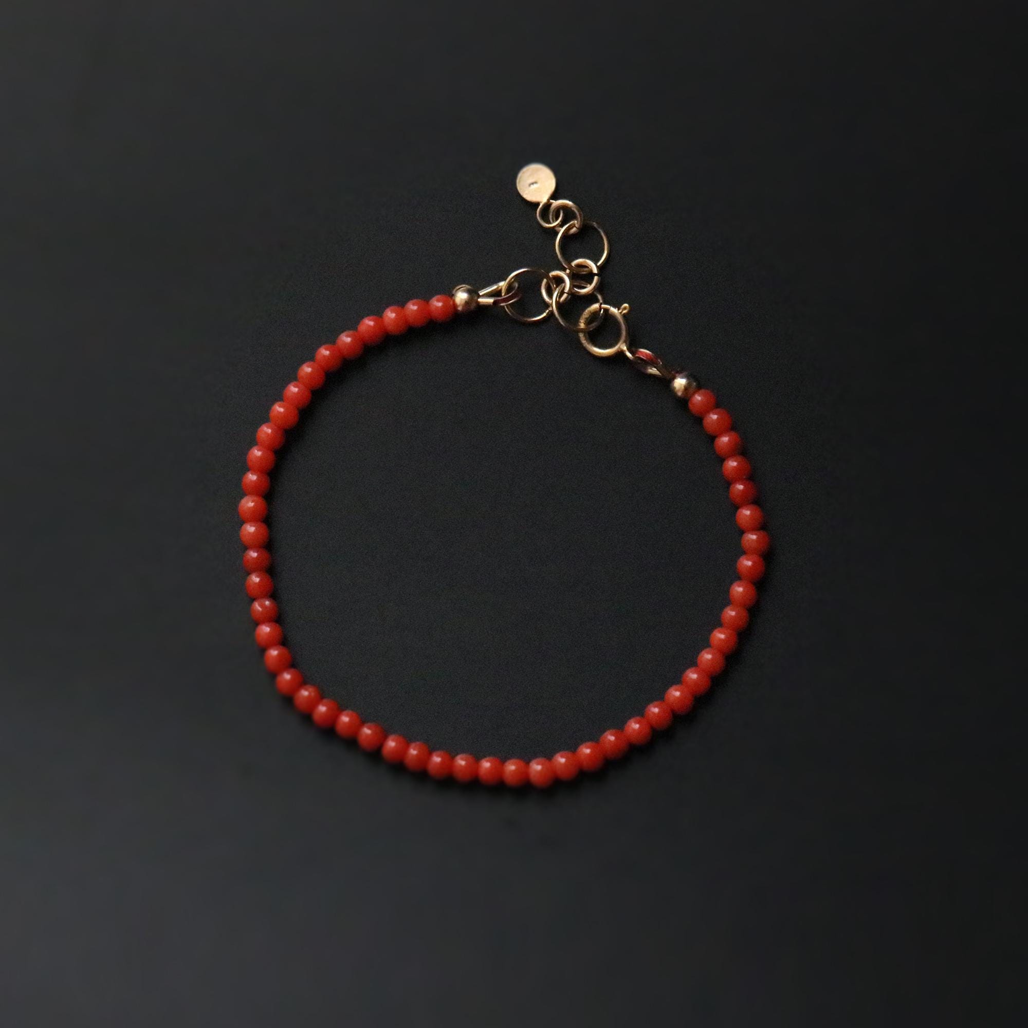 This delicate bracelet is handcrafted using authentic Italian coral beads (3mm), known for their rich, natural red hue and timeless beauty. The bracelet is finished with high-quality 14k gold filled components.