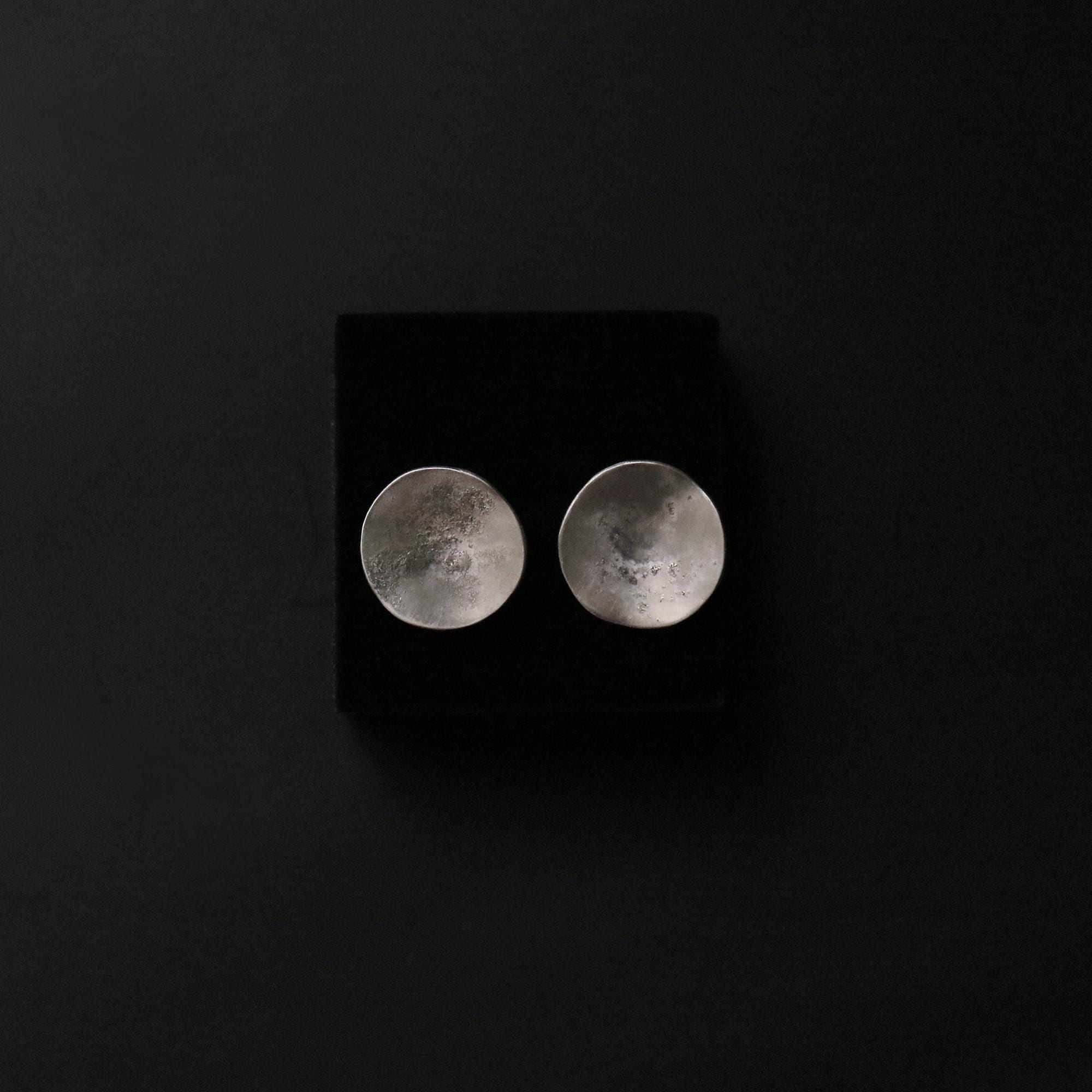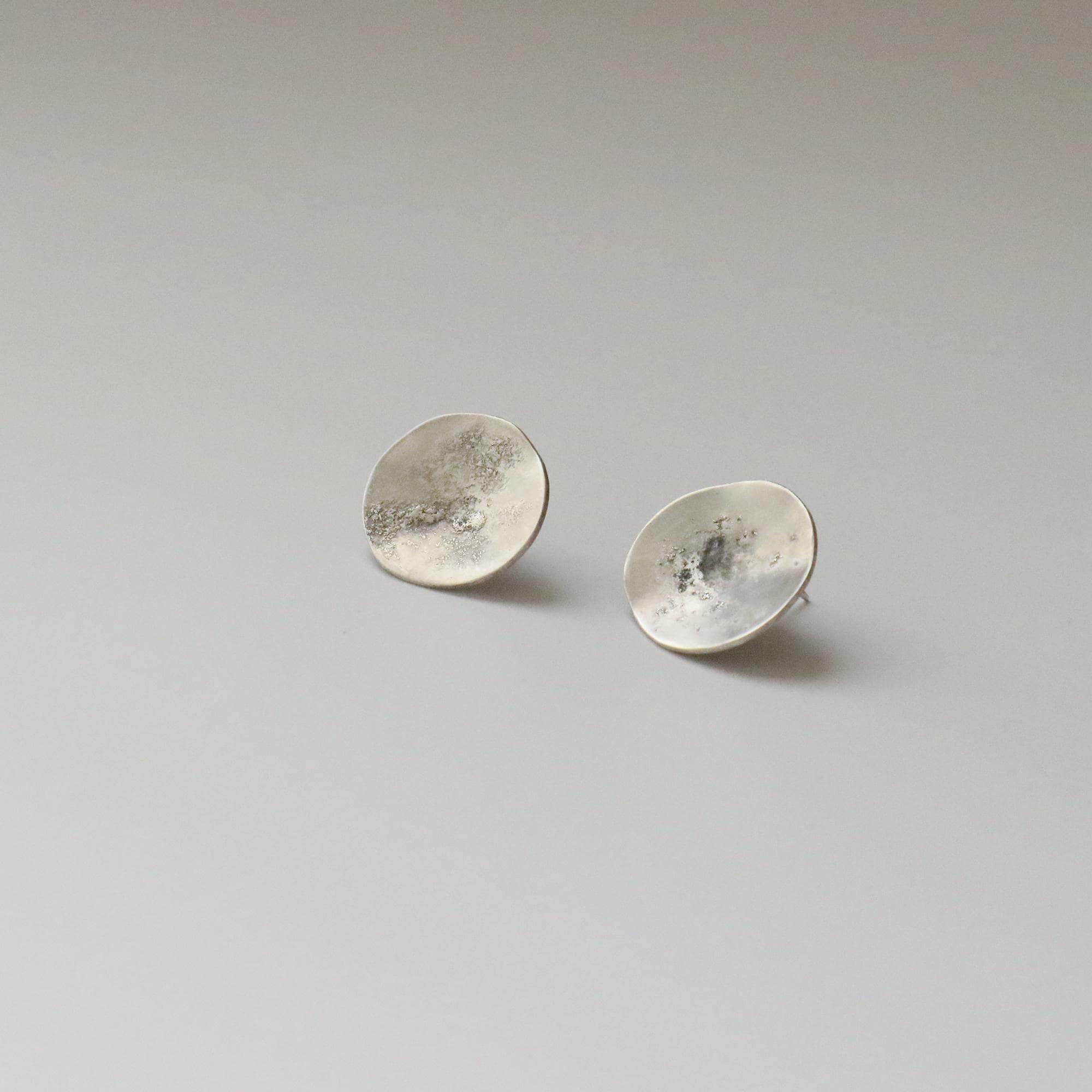 These one-of-a-kind sterling silver stud earrings feature a beautifully irregular, crater-like surface that evokes natural textures and lunar landscapes. Handcrafted using traditional silversmithing techniques, each earring is slightly domed and uniquely textured, giving them a raw, organic feel.