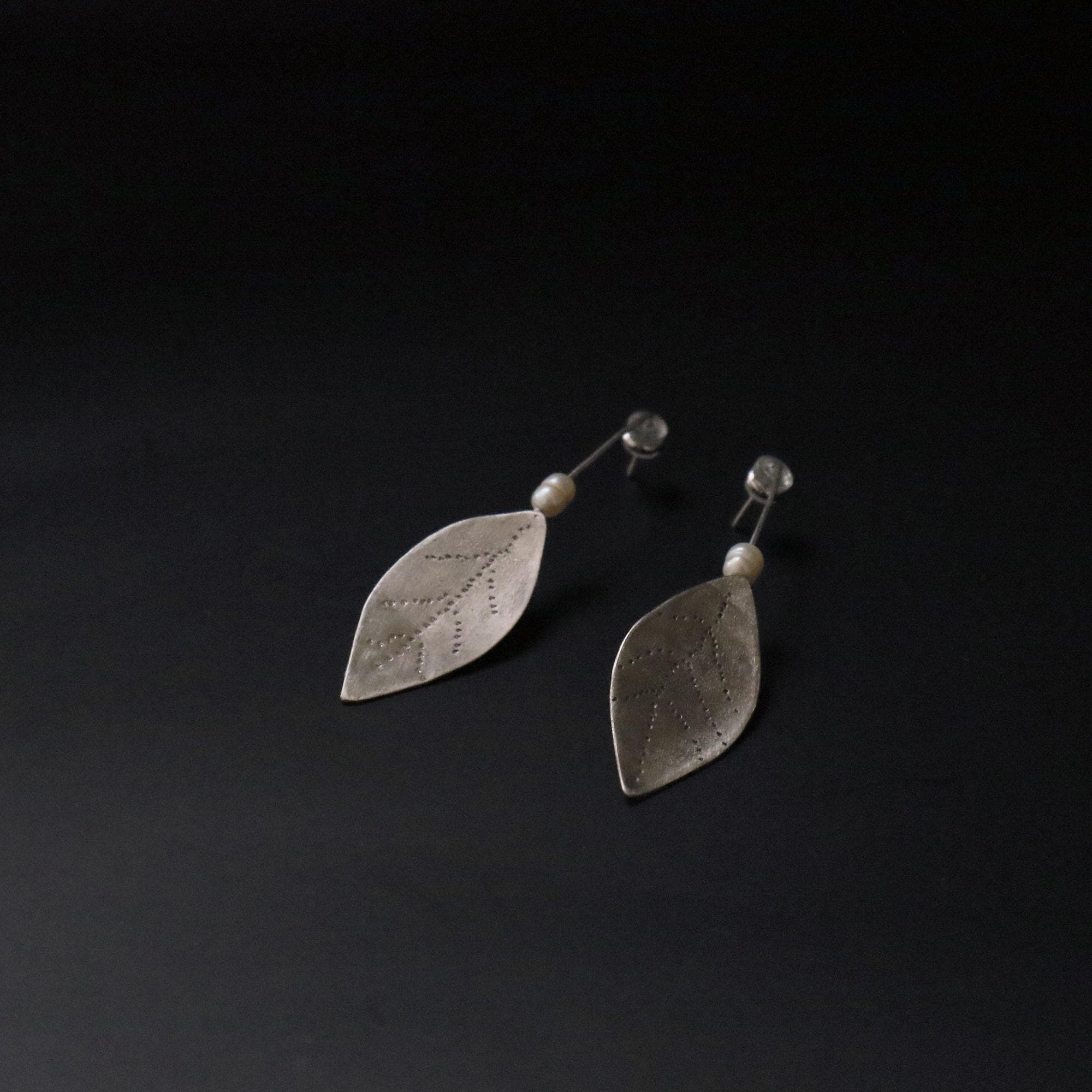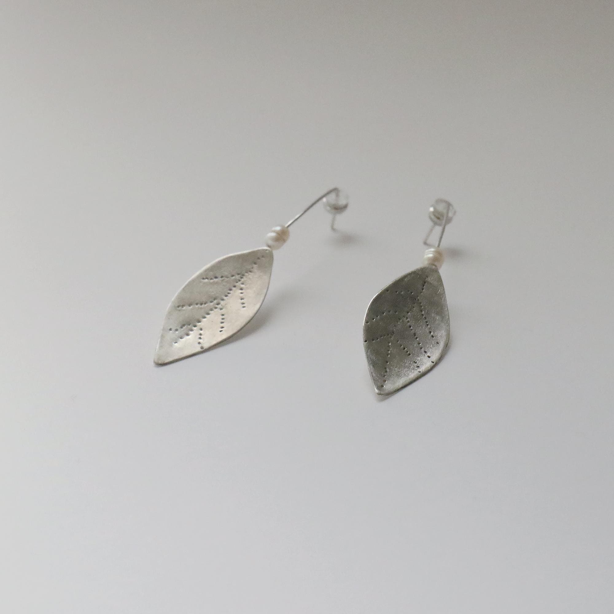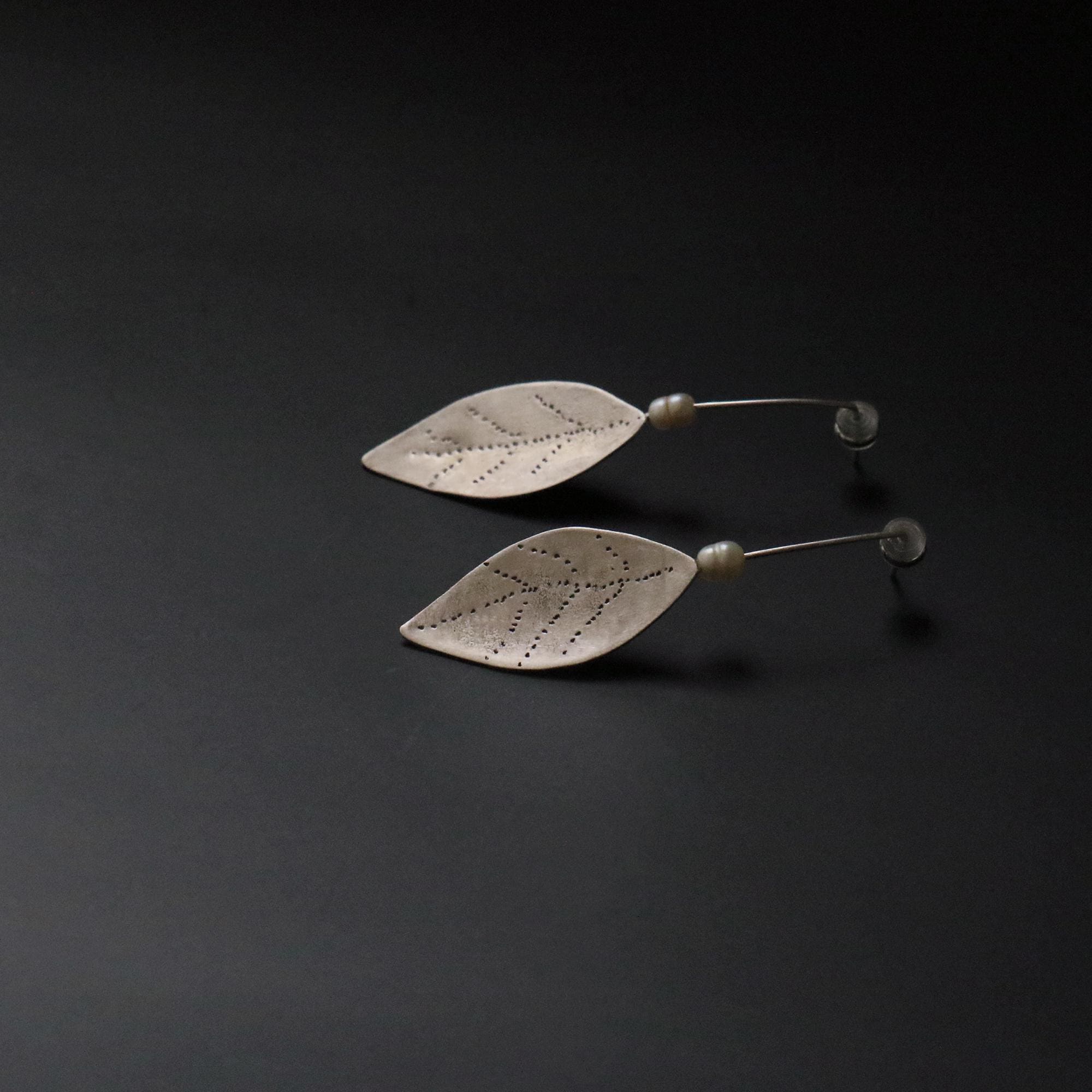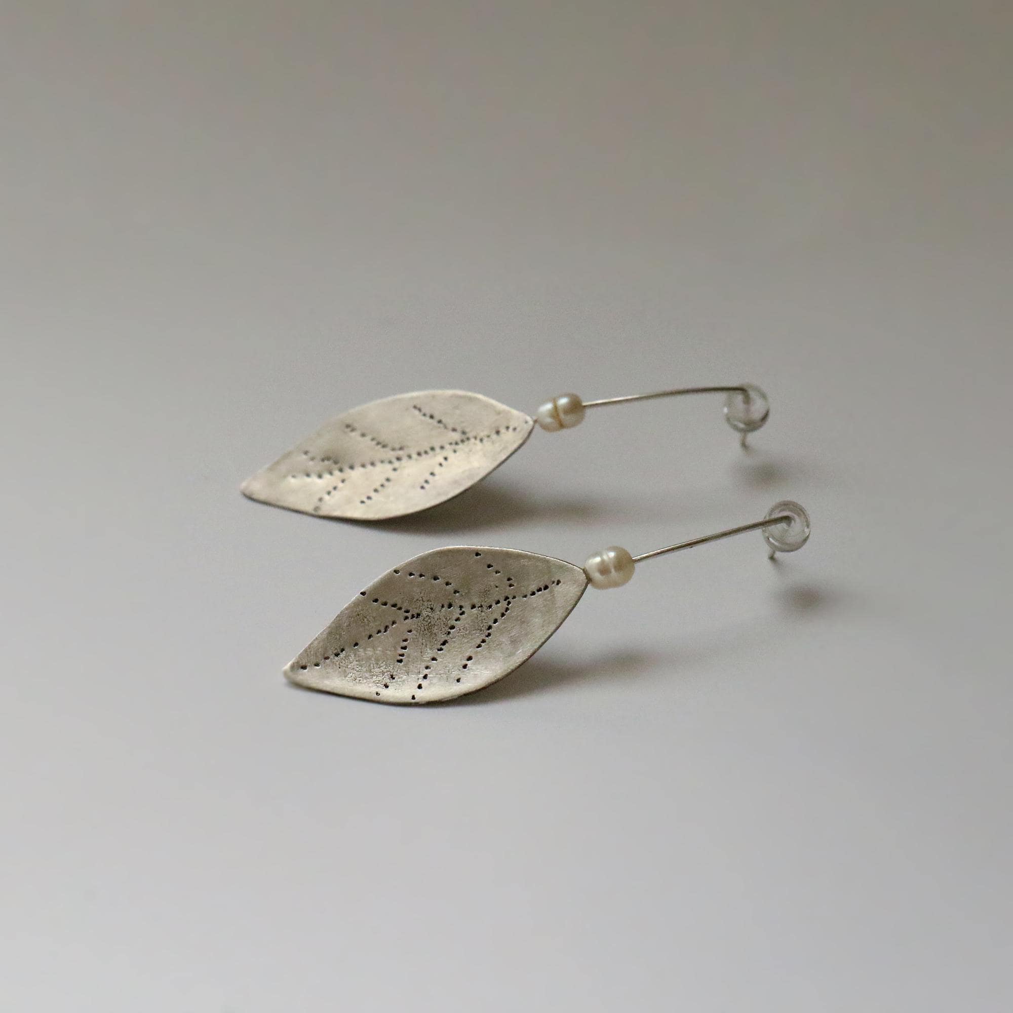 These exquisite handmade earrings feature delicately crafted laurel leaves, forged from high-quality silver. Each leaf is intricately detailed with fine dot-texturing, resembling the natural veining of a real laurel leaf. Suspended from a slender silver wire and accented with a single freshwater pearl, these earrings embody elegance and organic beauty.