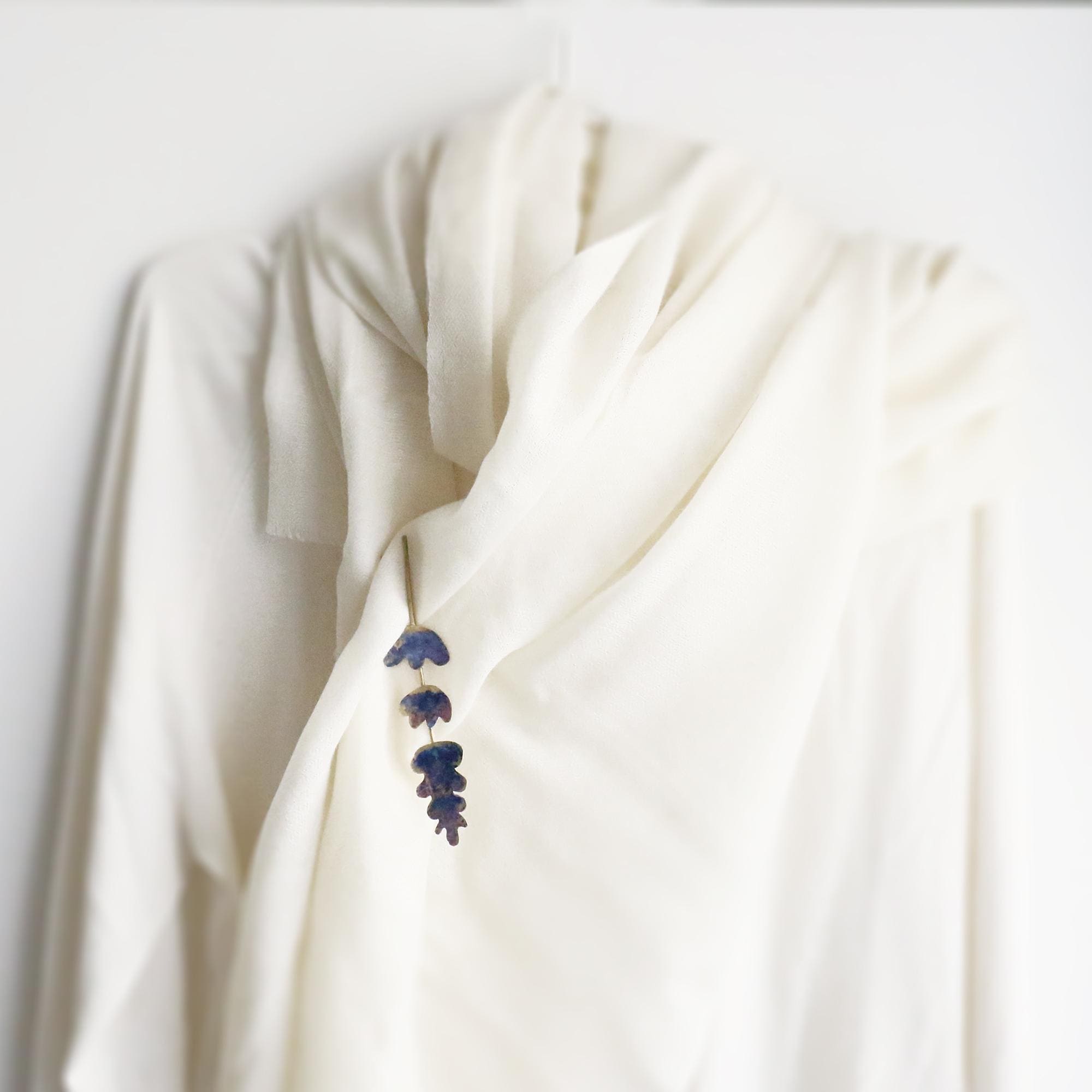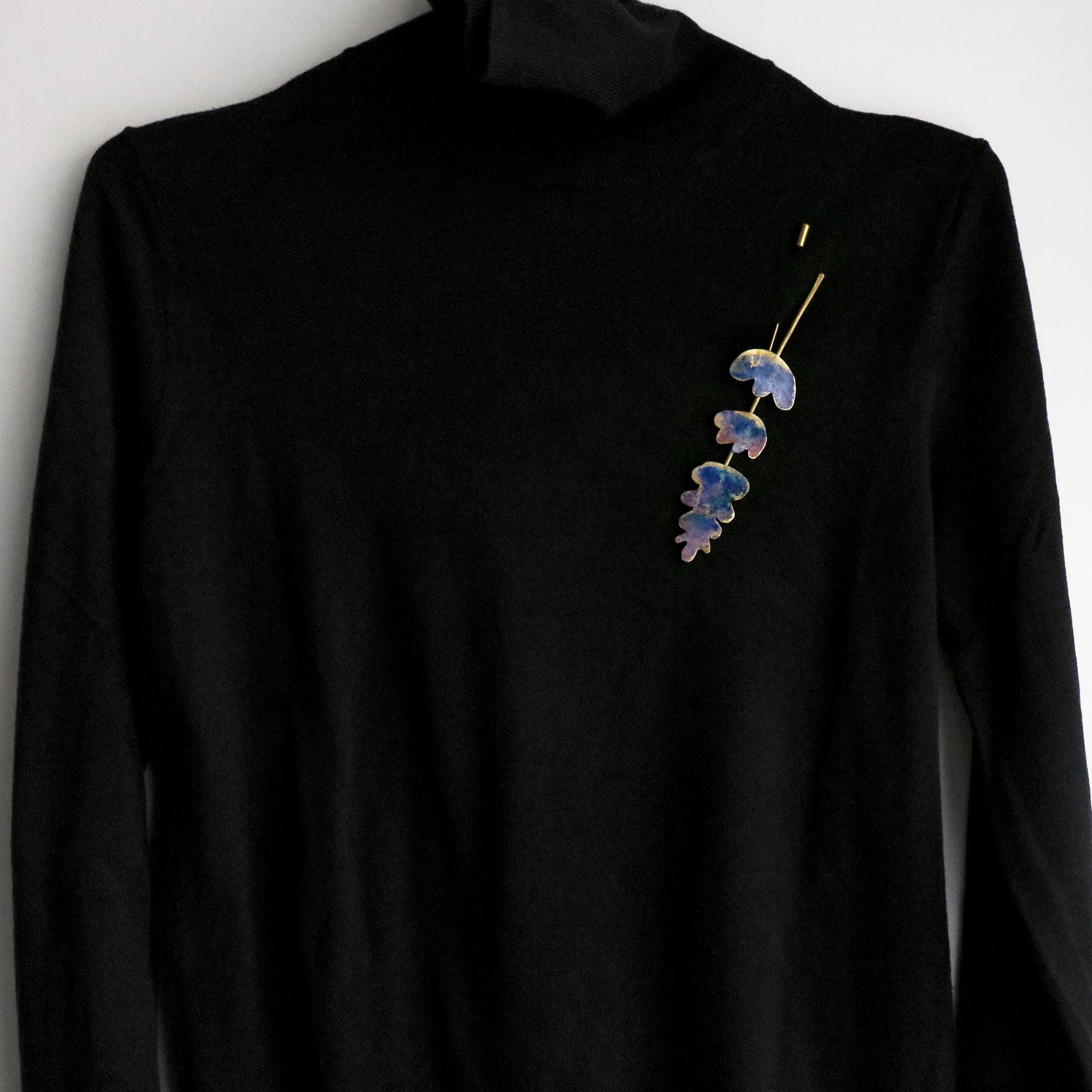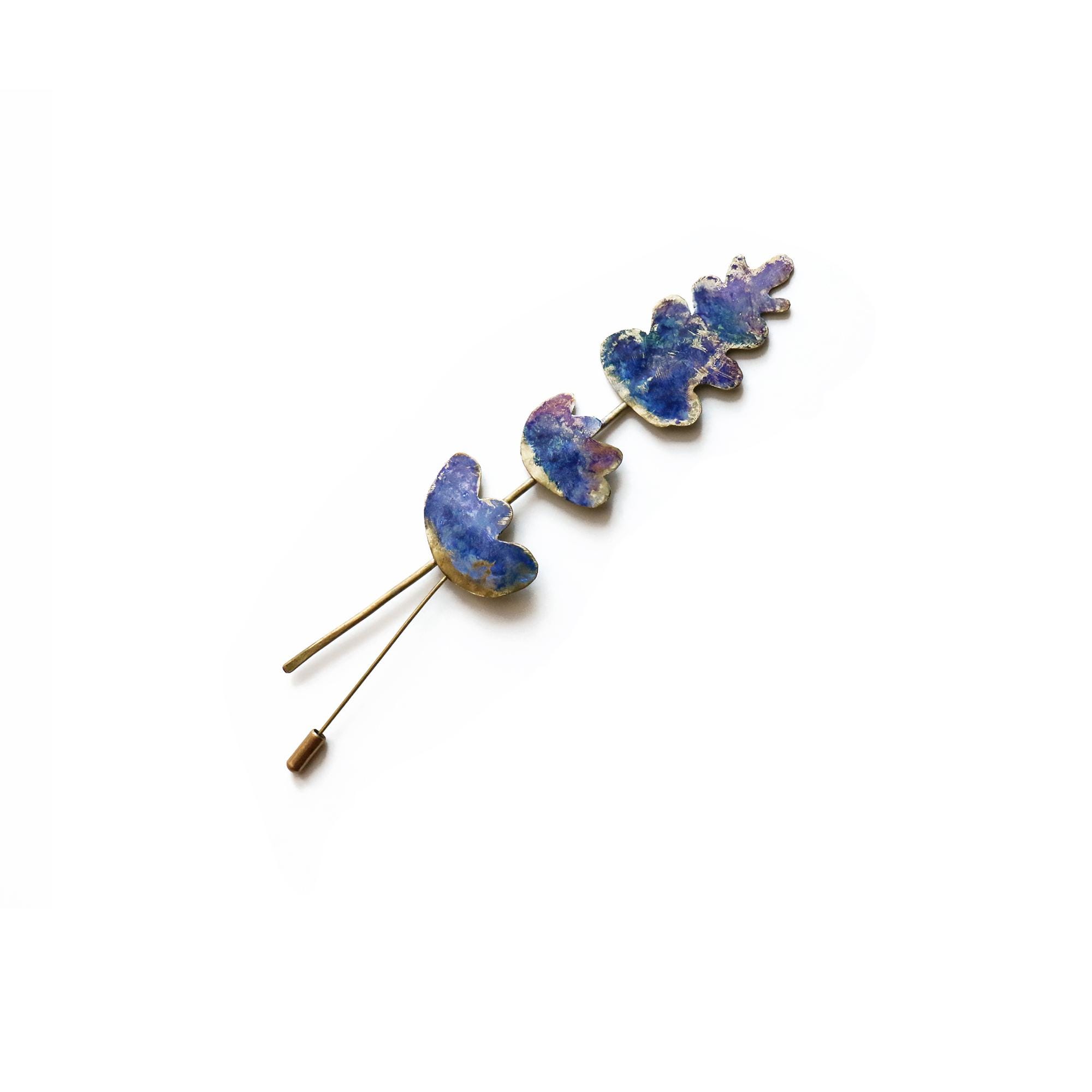 This elegant handmade brooch is crafted from brass and delicately hand-painted in shades of lavender blue and gold. Inspired by the natural beauty of lavender blossoms, each piece is unique — no two are ever the same.